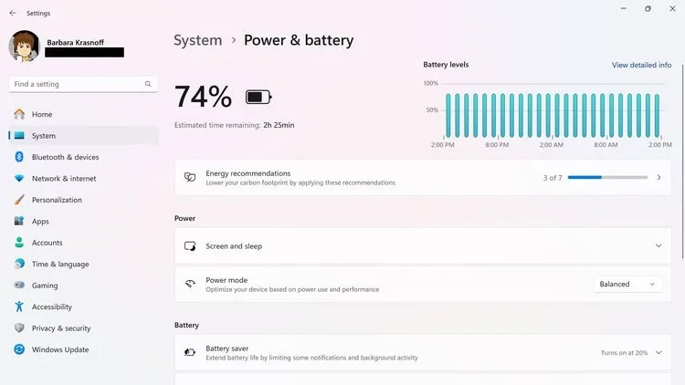 • You may also have a section called Energy recommendations at the top of the Power & battery page; it doesn’t hurt to click on that and check out some of those recommendations.